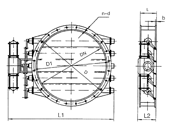 DN | D | D1 | L | L1 | L2 | b | n-d | 氣動裝置 | 風(fēng)機 | 重量(kg) |