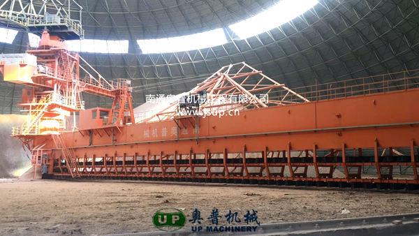 懸臂堆料系統(tǒng)、橋式刮板取料系統(tǒng)、料耙系統(tǒng)、中心柱機(jī)構(gòu)、回轉(zhuǎn)部分、潤滑系統(tǒng)、軌道系統(tǒng)、控制室等部件組成。