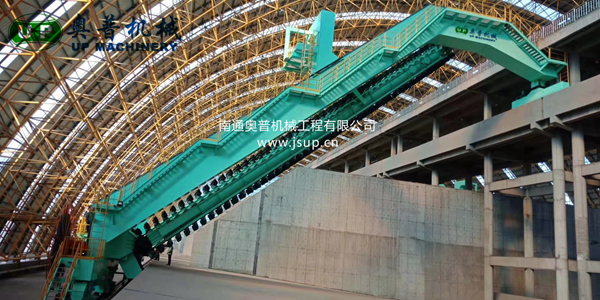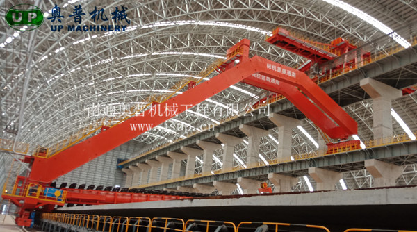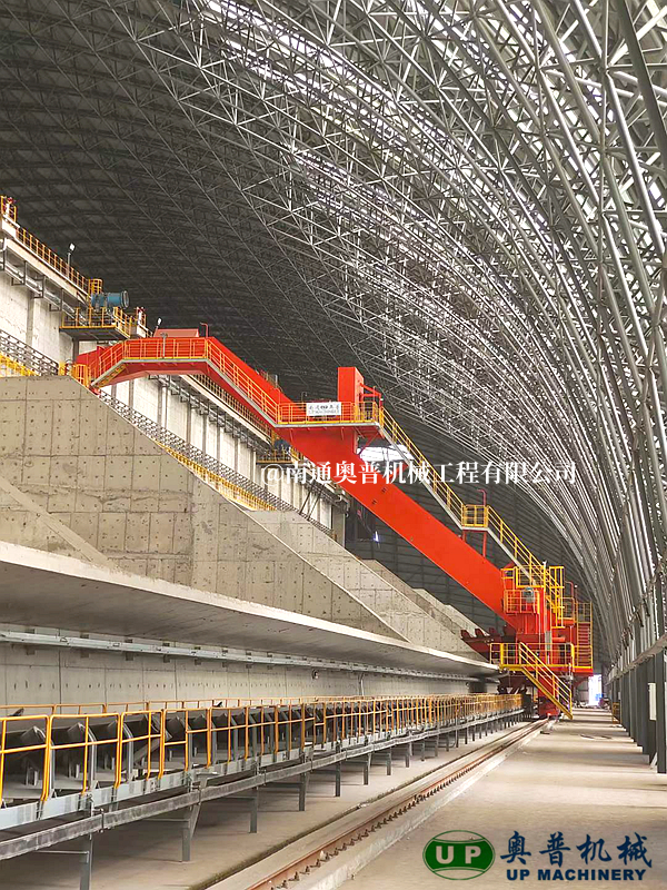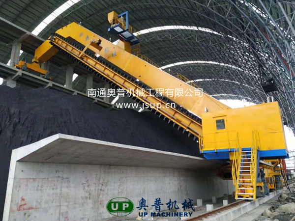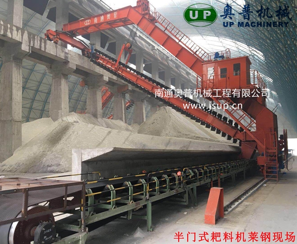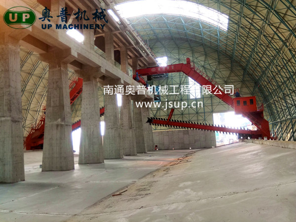 ▲南通奧普機(jī)械創(chuàng)新研制的“雙刮板、雙卷?yè)P(yáng)、翹尾式”半門式刮板取料機(jī)