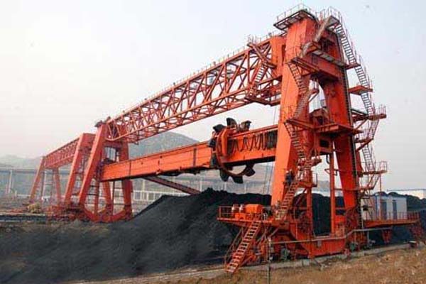 斗輪堆取料機的特征是一個裝有斗輪的牽引機構在散料場地上萬向行走,通過一個輸送臂牽引著軌道行走機構在軌道上滑行。