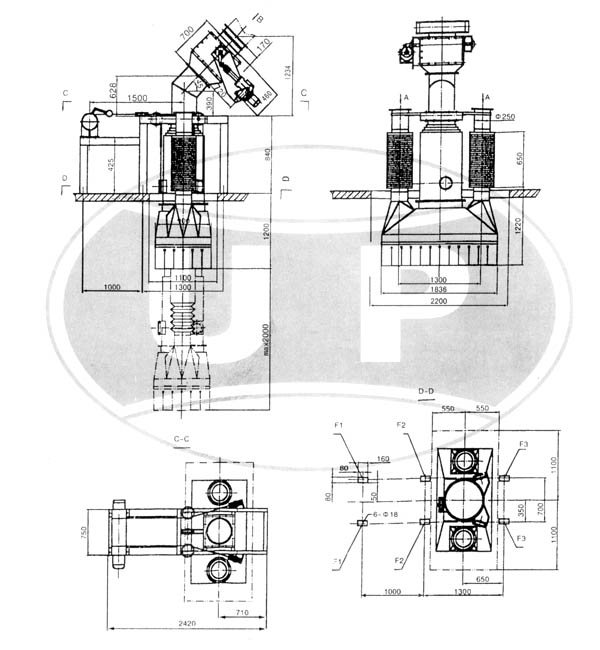 | 設(shè)備基礎(chǔ)及埋件載荷 1.提升裝置:FV=5KN×1.5 FH=20KN×2 2.進料口法蘭:FV=50KN 3.散裝頭基礎(chǔ):FV=4×10KN×15注四個柱腳止均為:10KN×1.5(系數(shù)) FV垂直載荷 FH為水平載荷 |